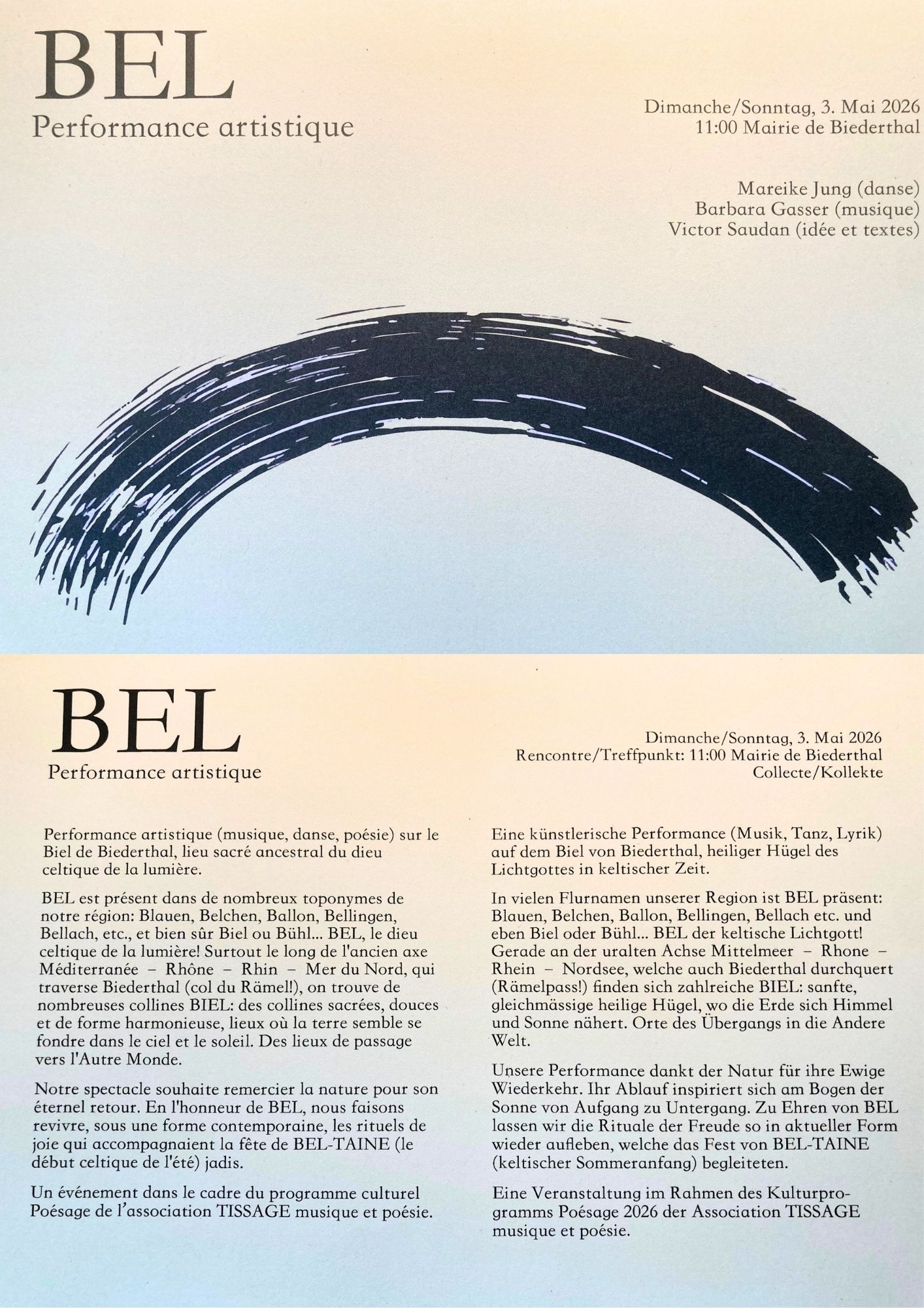 3 mai, 11h–12h – BEL performance musicale et poétique, danse sur le lieu-dit du Biel près de Biederthal, Natura 2000, avec Barbara Gasser, violoncelle, Mareike Jung, danse, Victor Saudan, récitation et brodésie. Dans le cadre du programme culturel de l’association TISSAGE. Voir le flyer