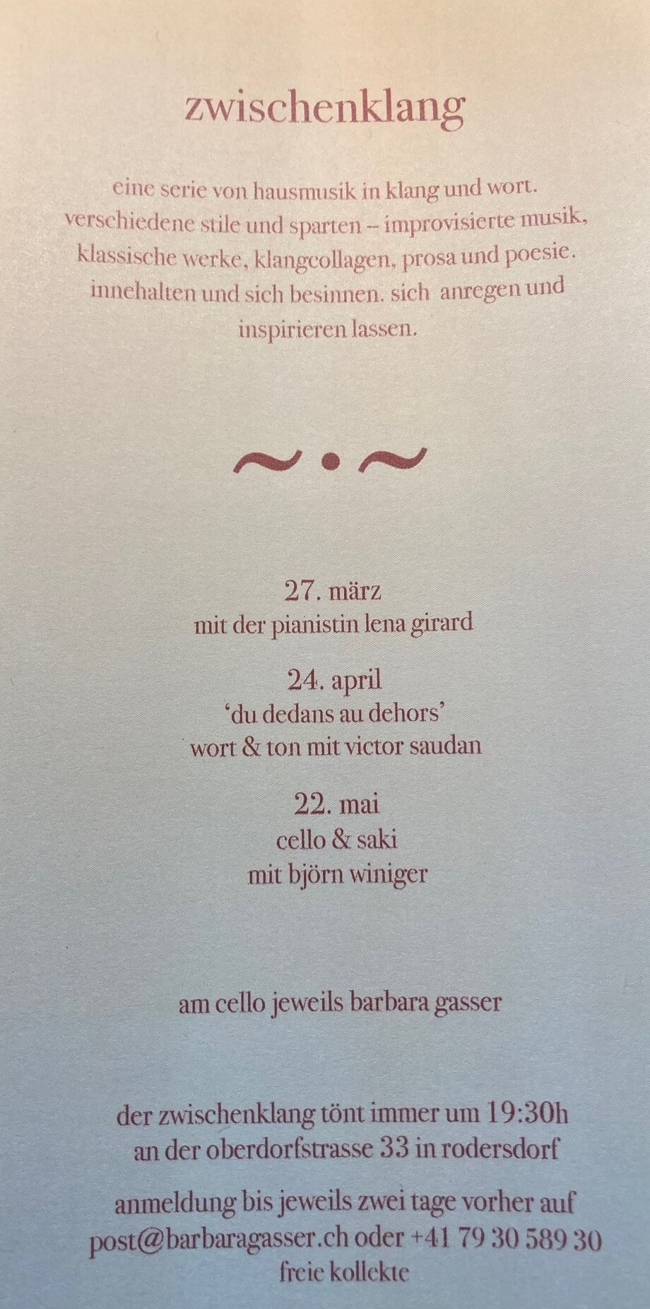 24 avril 2026, 19h30 – Im Rahmen von Zwischenklang 2026: Vo d’Inne nach d’Usse. Gedichte und Cello. Mit Barbara Gasser. Oberdorfstrasse 33 à Rodersdorf. Voir le flyer
